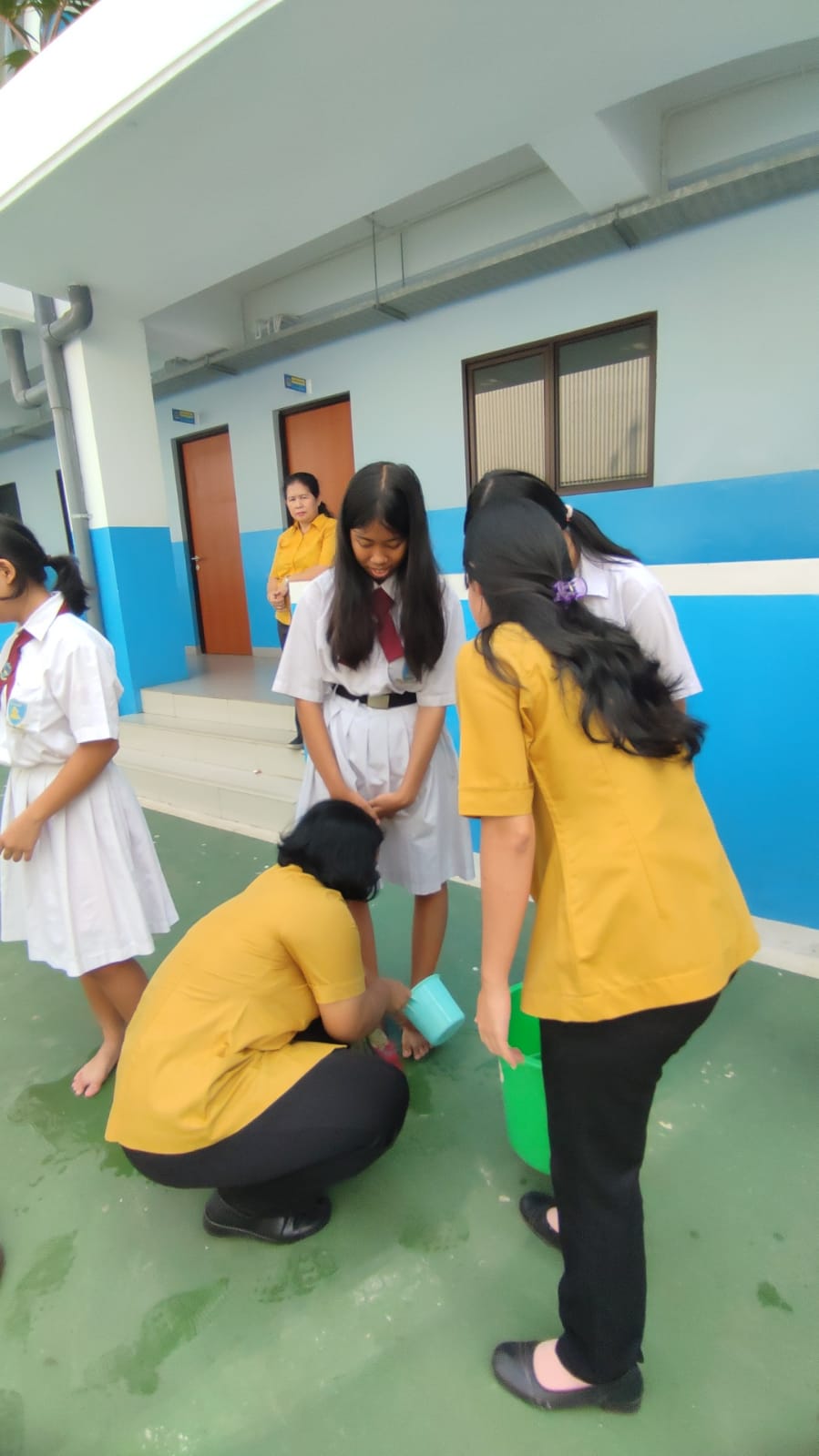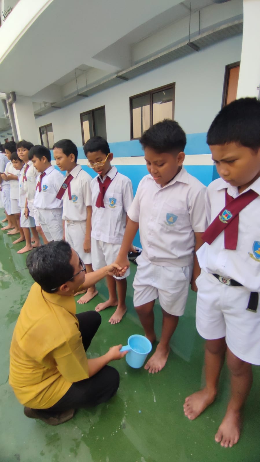 Setelah pengumuman selesai, suasana pun berubah menjadi santai dan penuh keceriaan. Acara selanjutnya adalah tradisi unik yang selalu dinantikan setiap tahun: pembasuhan kaki siswa oleh para guru. Ini adalah momen di mana siswa kelas 6 berdiri berbaris, sementara para guru dengan hati-hati membawa ember-ember air yang telah dihiasi dengan air.